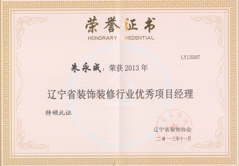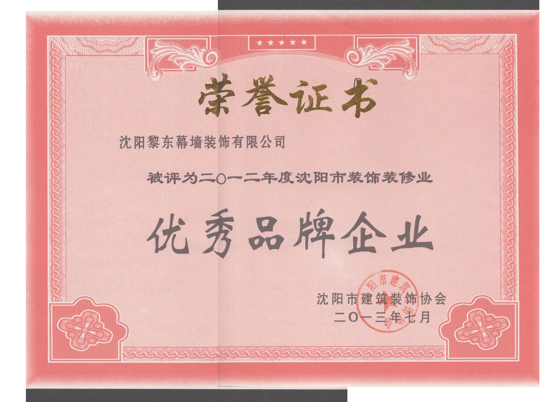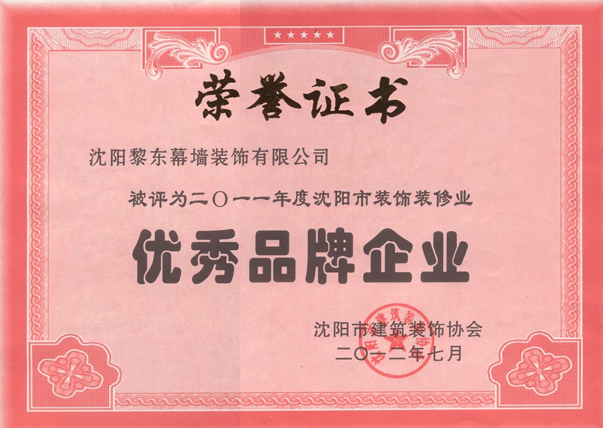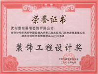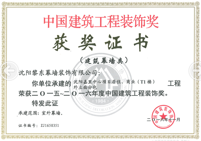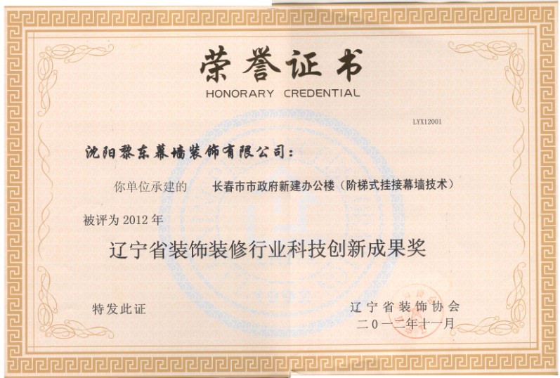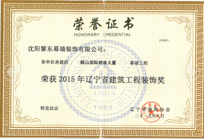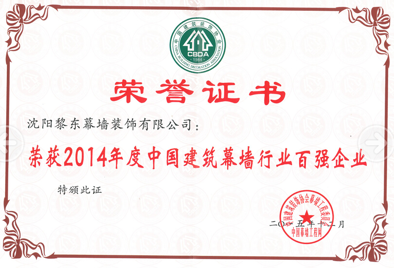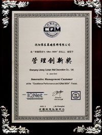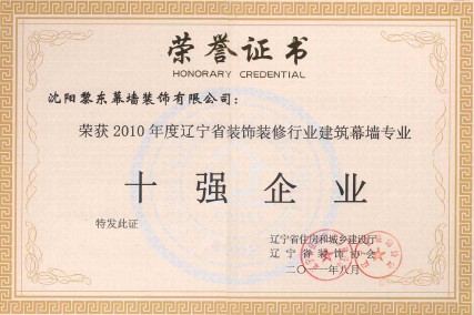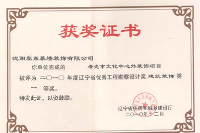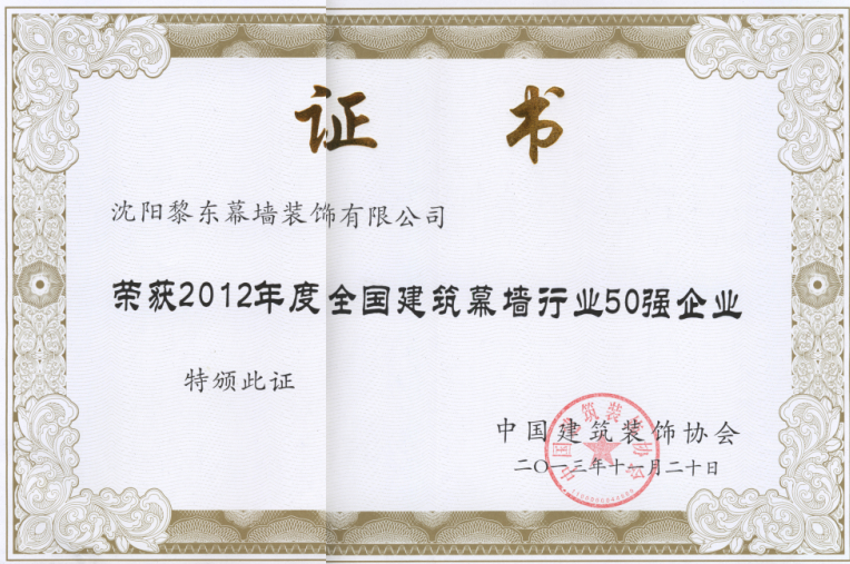 | 2010年榮獲遼寧省裝飾裝修行業(yè)優(yōu)秀企業(yè)家 | 2012年榮獲全國建筑幕墻行業(yè)50強企業(yè) | 2012年榮獲沈陽市守合同重信用單位 |