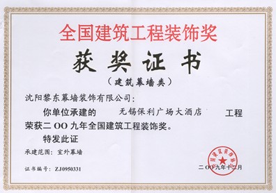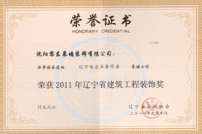 | 2011年遼寧電臺業(yè)務(wù)用房幕墻工程榮獲遼寧省建筑工程裝飾獎 | 2011年中興——沈陽商業(yè)大廈三期榮獲遼寧省建筑工程裝飾獎 | 2011年被評為沈陽市裝飾裝修業(yè)優(yōu)秀品牌企業(yè) |