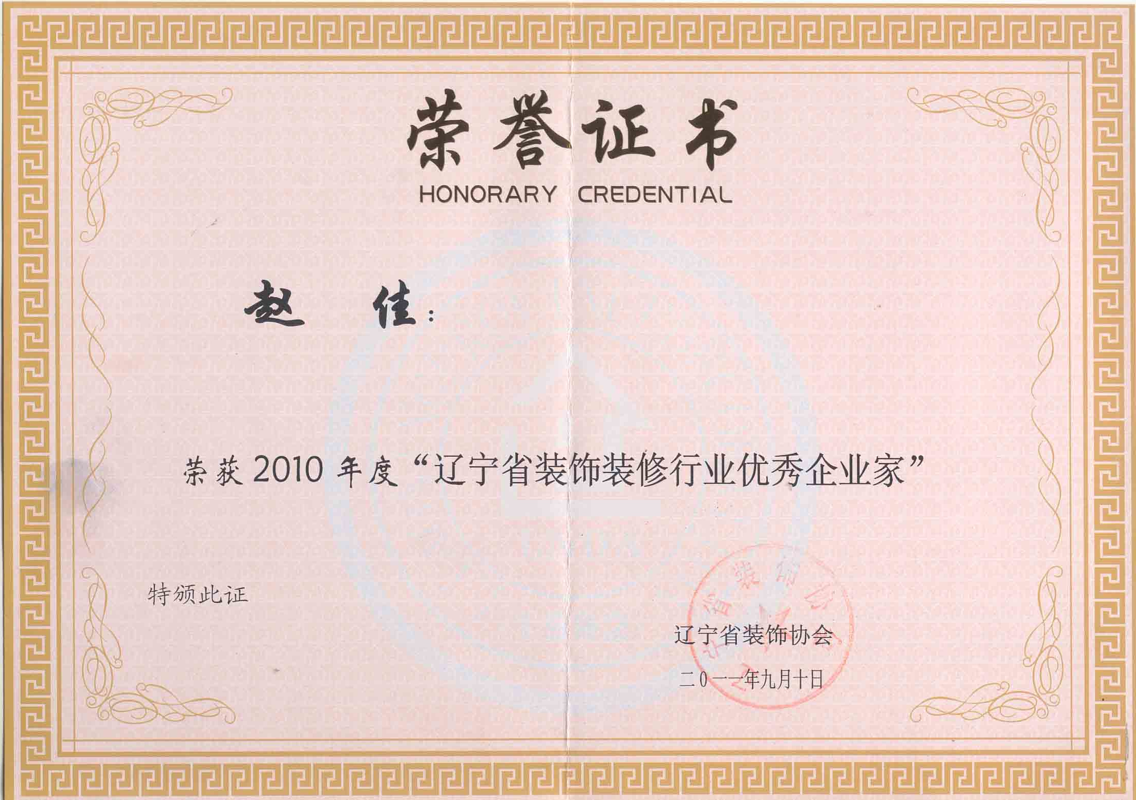 | 2009年獲無錫保利廣場大酒店全國建筑工程裝飾獎 | 2009年趙佳獲遼寧省裝飾裝修行業(yè)優(yōu)秀企業(yè)家 | 2009年度遼寧省裝修裝飾行業(yè)十強企業(yè) |