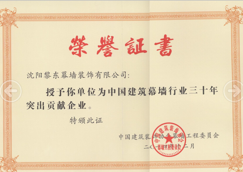 | 2012年被評為安全生產(chǎn)標準化二級企業(yè) | 2013年獲得常務(wù)理事獎 | 2014年獲中國建筑幕墻行業(yè)三十年突出貢獻企業(yè) |