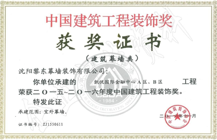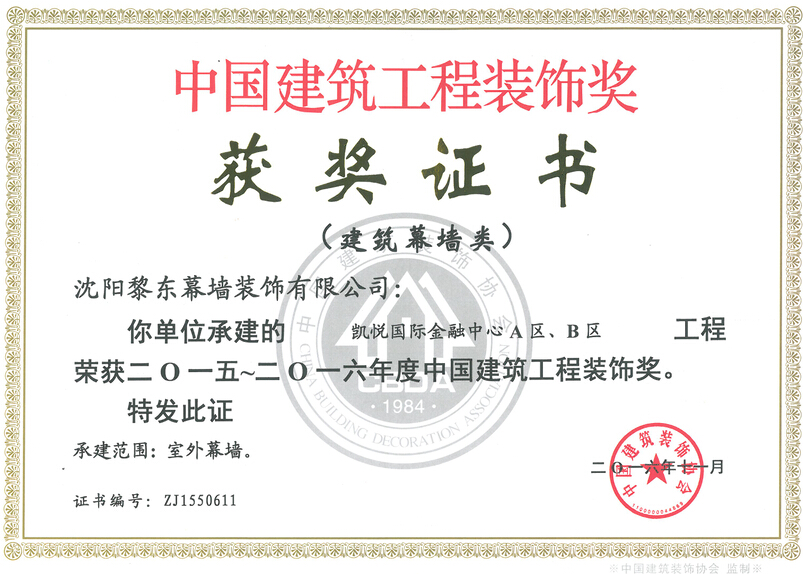 | 2013-2014年盤錦中心醫(yī)院幕墻榮獲全國建筑工程裝飾獎 | 2015-2016凱悅國際金融中心A、B區(qū)獲中國建筑工程裝飾獎 |
