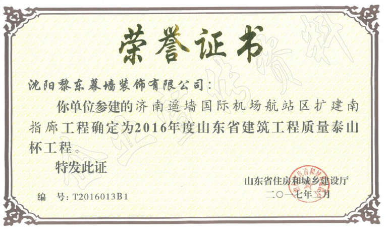 | 2016年榮獲遼寧省裝飾裝修行業(yè)十強企業(yè) | 2016年濟南遙墻國際機場航站區(qū)擴建南指廊榮獲山東建筑工程質(zhì)量泰山杯工程 | 2017年榮獲遼寧省裝飾裝修行業(yè)十強企業(yè) |