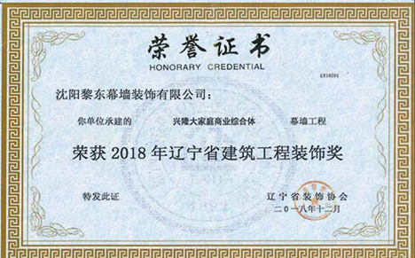 | 2018年興隆大家庭商業(yè)綜合體幕墻工程榮獲中國工程裝飾獎 | ||